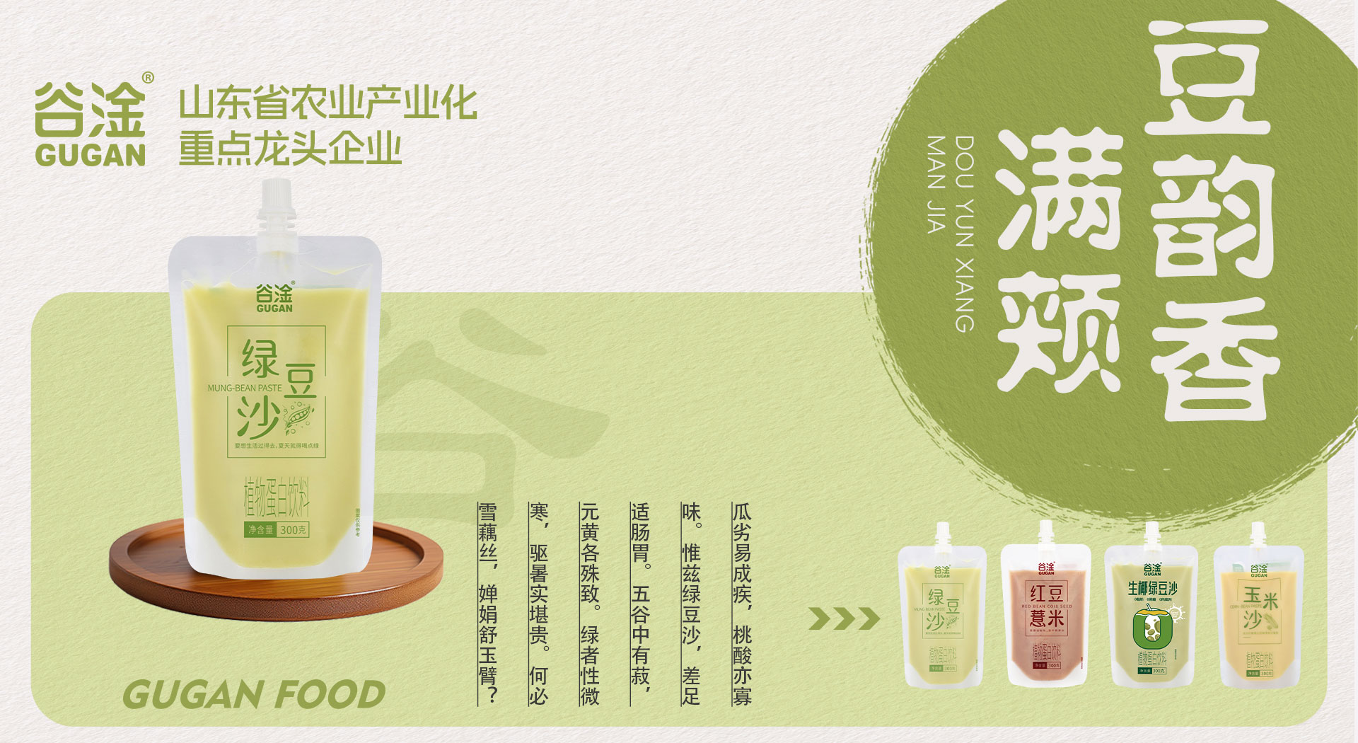 山東谷淦食品有限公司總部位于山東省淄博市,是一家集生態化農業種植、中草藥種植、農副產品加工、商貿物流、營銷服務于一體的農業產業化省級重點龍頭企業,從生產到終端,構建農工商高度融合、一二三產業相互支撐的現代化經營體系。集團公司主要產品包括谷物飲料、植物蛋白飲料、八寶粥、奶昔及果汁飲料、中式養生飲品等系列方便食品,旗下擁有“谷淦”、“福粥來”、“頤慕”、“甘噸噸”、“妃生元”、“植豆說”等眾多品牌。